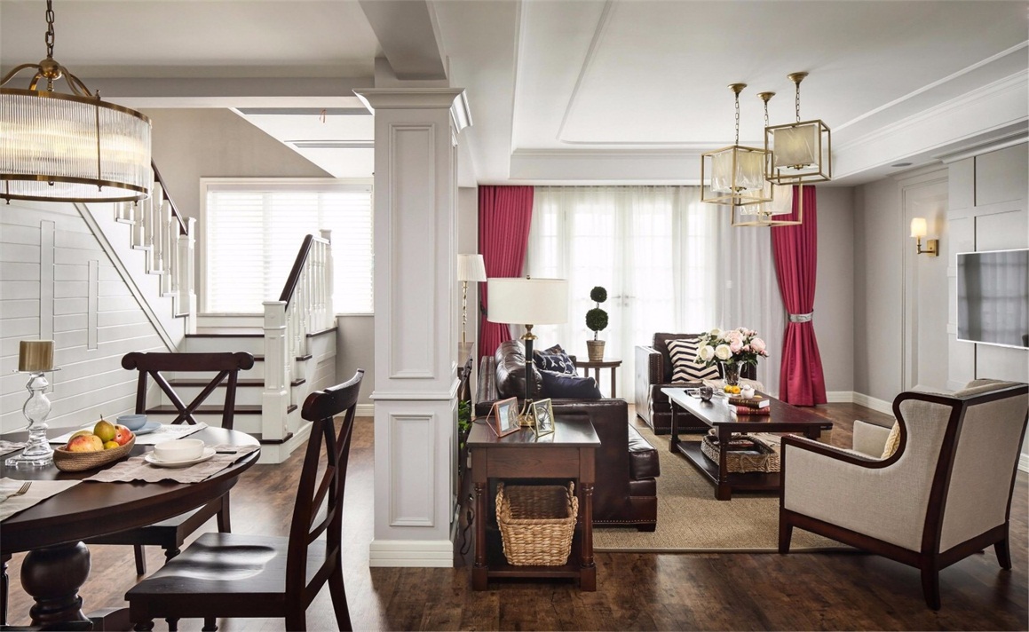 木地板、不銹鋼線條、定制實木護墻板、乳膠漆。