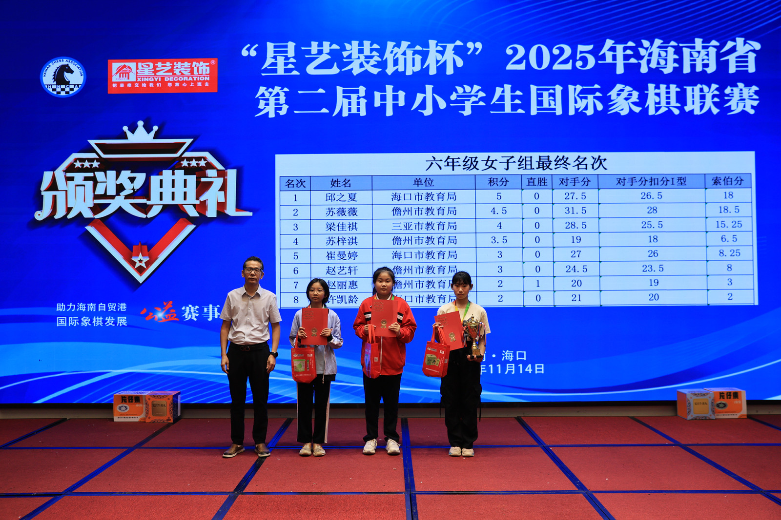 智慧對弈,榮耀加冕。2025年11月14日,“星藝裝飾杯”2025 年海南省第二屆中小學生國際象棋聯賽在海口市駿豪酒店舉行閉幕頒獎典禮。